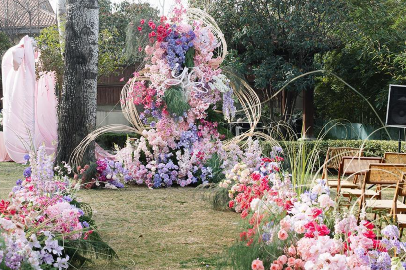 场布含策划、设计、硬装、花艺、观礼椅、音响等;